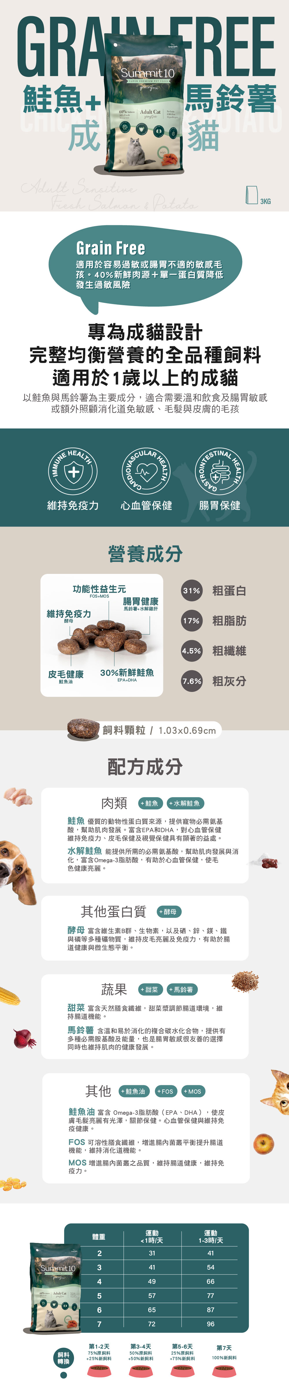 - 適用額外照顧消化道敏感、毛髮與皮膚的成貓