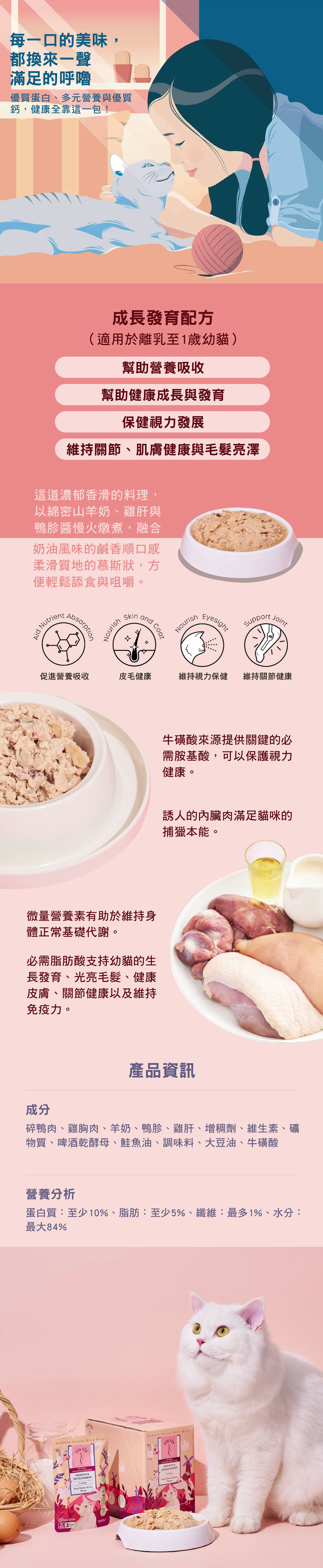 這款精心設計的配方,採用鴨肉與雞肉,經慢燉處理,使肉質更加嫩滑,搭配順滑的山羊奶、雞肝與鴨胃醬,形成細緻慕斯口感,讓幼貓更易進食與消化。
