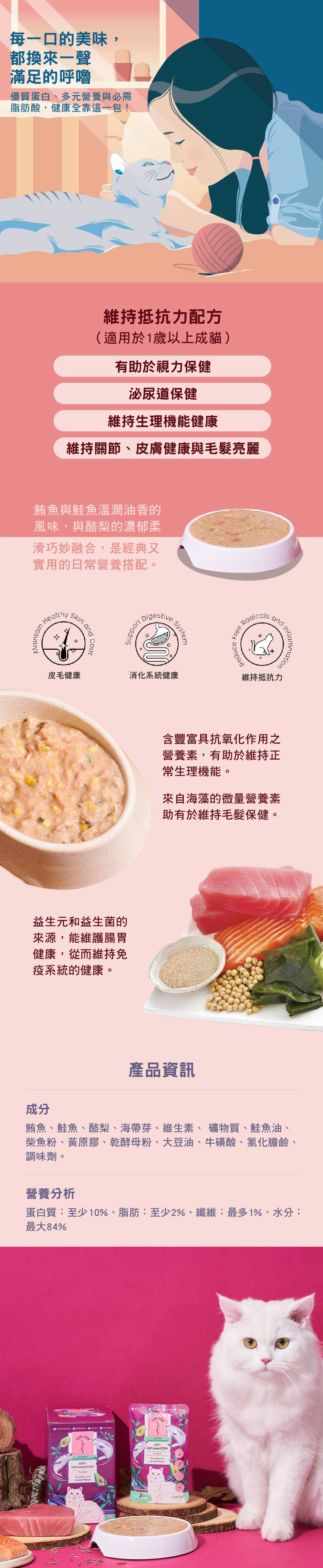 鮪魚、鮭魚、酪梨、海帶芽、維生素、 礦物質、鮭魚油、柴魚粉、黃原膠、乾酵母粉、大豆油、牛磺酸、氯化膽鹼、 調味劑。