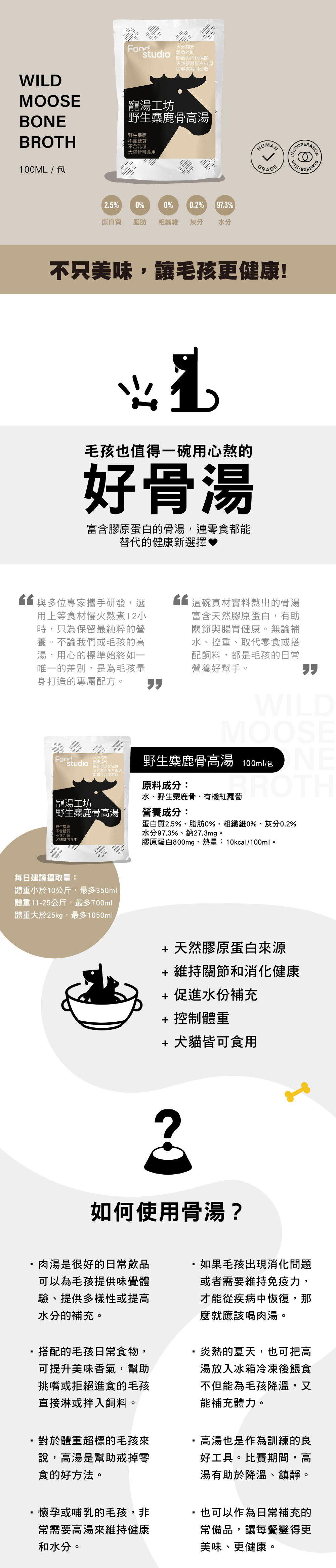 內容成分:水、野生麋鹿骨湯、有機紅蘿蔔